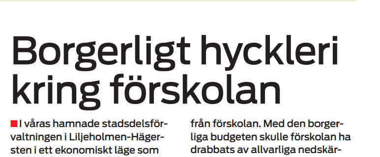 Men när de borgerliga partierna högljutt kritiserar nedskärningarna, då liknar det mest hyckleri. I deras budgetförslag för 2015 satsar de i genomsnitt 133 miljoner mindre än oss rödgrönrosa på stadsdelsnämnderna, varav 16,5 miljoner kronor skulle tagits från förskolan. Med den borgerliga budgeten skulle förskolan ha drabbats av allvarliga nedskärningar som riskerar att gå ut över barnens säkerhet.